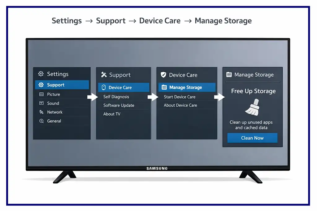 Щоб перевірити, скільки пам’яті використовується, відкрийте “Apps” на телевізорі та перейдіть до Налаштувань (іконка шестерні у верхньому правому куті). У цьому розділі зазвичай показано, скільки пам’яті займають додатки. На деяких моделях інформацію про пам’ять також можна знайти в Налаштування → Підтримка → Догляд за пристроєм → Керування сховищем, де телевізор показує, скільки пам’яті використано і скільки доступно.