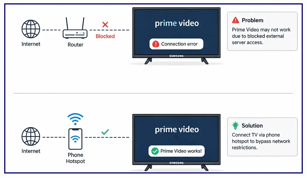 Іноді проблема полягає не в самому додатку Prime Video, а в інтернет-з’єднанні. Хоча додаток безпосередньо транслює контент, він також обмінюється певними даними з серверами Samsung. Якщо доступ до зовнішніх серверів обмежено або заблоковано налаштуваннями мережі, Prime Video може працювати неправильно.