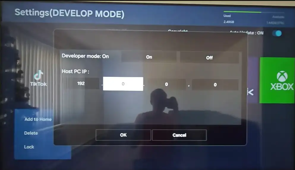 Щоб увімкнути режим розробника, виконайте наступне. Відкрийте розділ «Додатки» на телевізорі та перейдіть до екрана магазину додатків. Перейдіть до налаштувань. Коли з’явиться поле для введення цифр, за допомогою пульта введіть послідовність 1, 2, 3, 4, 5. Відкриється меню «Режим розробника». Залежно від версії ОС поле введення може відрізнятися на деяких моделях телевізорів. Потрібно натиснути кнопку на пульті, яка відображає цифри на екрані телевізора, після чого цифри з’являться на екрані, і їх слід вибрати по порядку від 1 до 5.