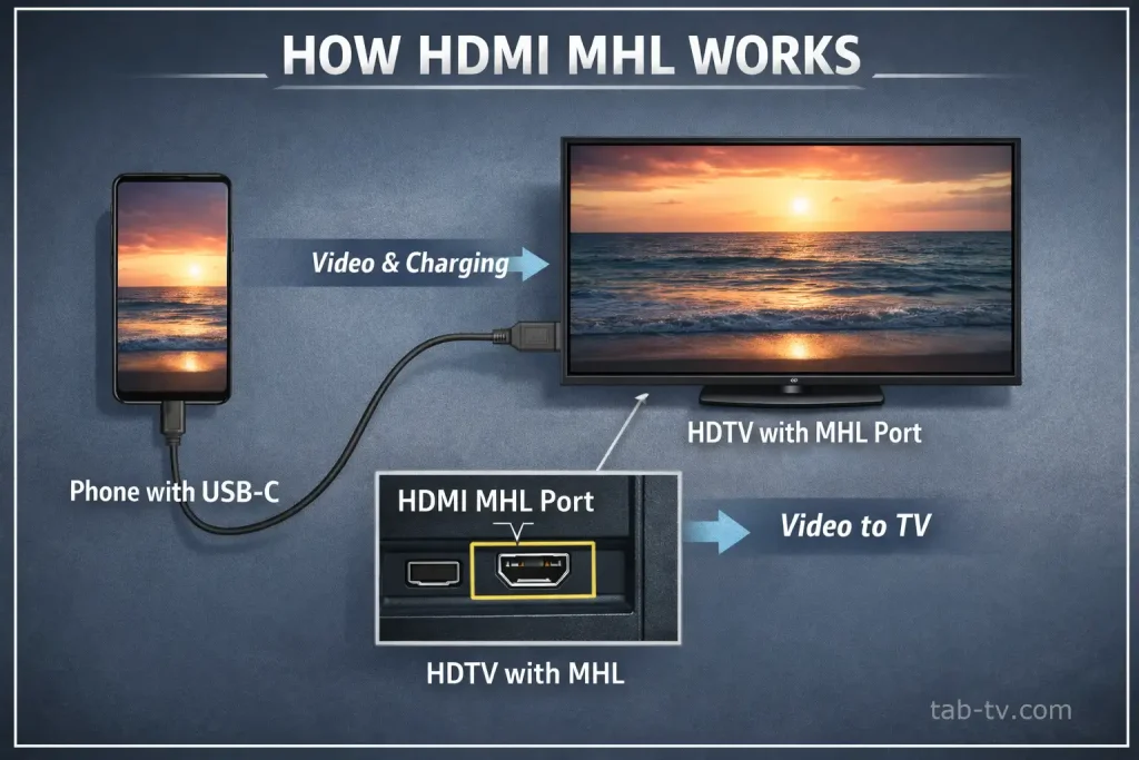 Позначка MHL стосується застарілої технології підключення смартфонів через USB до HDMI — сьогодні вона використовується рідко. Цей порт містить чіп, який перетворює сигнал із USB-C у HDMI; раніше його в основному використовували для передачі відео та фотографій зі смартфона на телевізор.