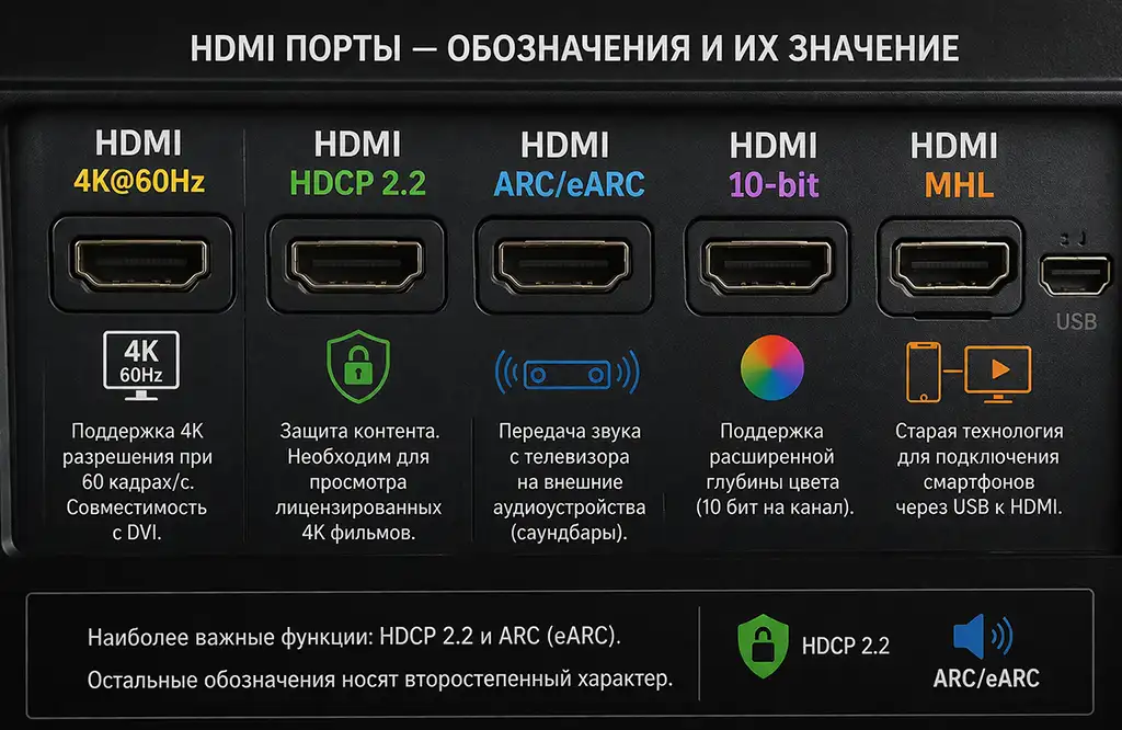 HDCP 2.2 і ARC є важливими, тоді як інші позначки мають другорядне значення.