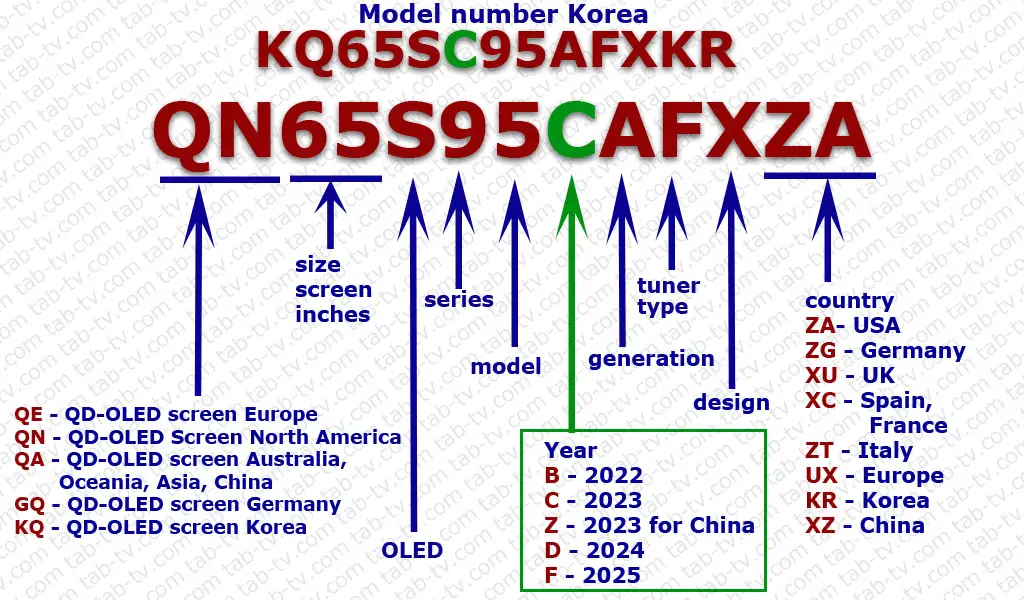 Наприклад, я поясню, як розшифрувати модельний номер OLED телевізора 2023 QN65S95CAFXZA. Також я покажу модельний номер Samsung OLED телевізора, що використовується в Кореї, KQ65SC95AFXKR. У Кореї модельний номер трохи відрізняється, і літера, що позначає рік, розміщена в іншому місці.