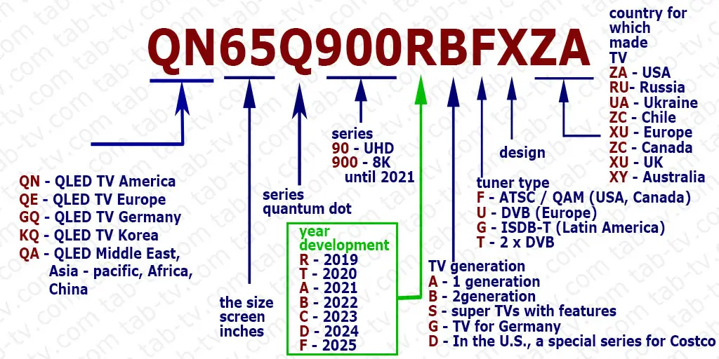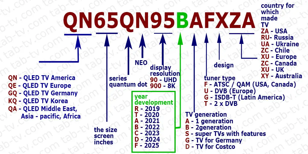 Розшифровка номера моделі Neo QLED подібна, за винятком того, що після розміру екрану буде два символи QN.