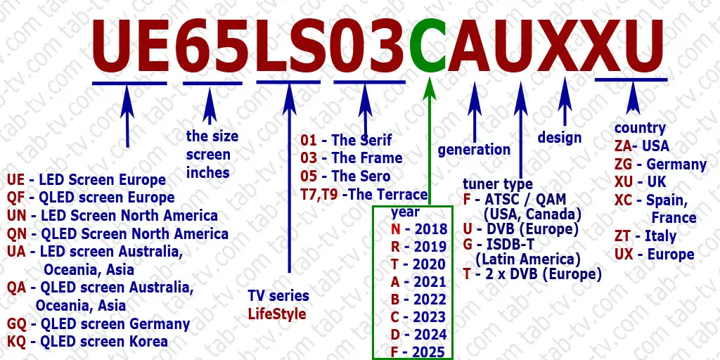 Телевізори Samsung LifeStyle мають унікальну систему модельних номерів, яка з часом змінилася. Спочатку модельні номери мали трохи інший формат, наприклад, 2017 року UE65LS003AUXRU. Однак у 2018 році Samsung оновила формат, додавши літеру для позначення року дизайну, в результаті чого з’явилися модельні номери, такі як UE65LS03NAUXXU. Модельні номери LifeStyle дотримуються тієї ж структури, що і LED і QLED телевізори, з додаванням коду “LS” для позначення серії LifeStyle і специфічного ідентифікатора типу телевізора LifeStyle. Ось посібник для розшифровки вашого модельного номера LifeStyle TV.