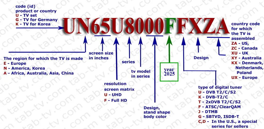 - U: Означає, що продукт є телевізором. Для кожного продукту Samsung є певна літера. Наприклад, телевізори, виготовлені для Німеччини, використовують букву G.