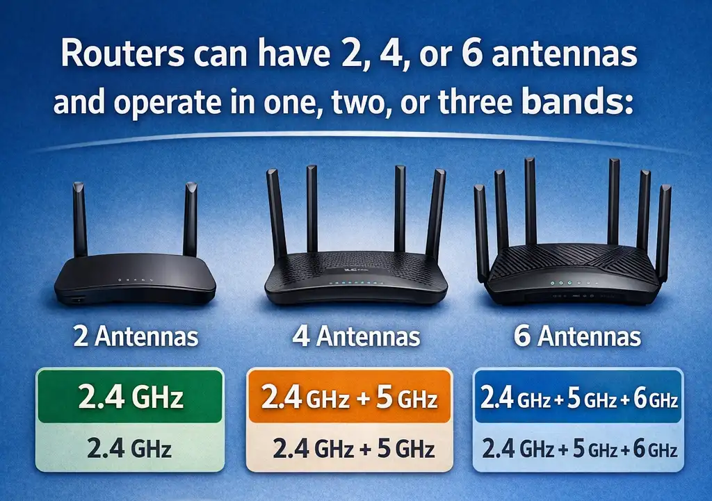 Сьогодні роутери можуть мати дві, чотири або шість антен і працювати в одному діапазоні (2,4 ГГц), двох діапазонах (2,4 ГГц і 5 ГГц) або трьох діапазонах (2,4 ГГц, 5 ГГц і 6 ГГц). Тому краще зосередитися на детальних технічних характеристиках, ніж на привабливих маркетингових термінах.