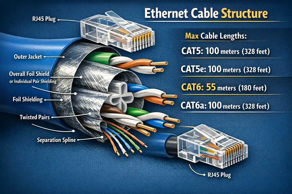 Максимальна довжина кабелю становить 100 метрів (328 футів) для CAT5 і CAT5e. Для CAT6 максимальна довжина становить 55 метрів (180 футів) при роботі на швидкості 10 Гбіт/с, а при 1 Гбіт/с вона може досягати 100 метрів. CAT6a підтримує швидкість 10 Гбіт/с на відстані 100 метрів (328 футів). Залежно від якості кабелю, ці кабелі можуть також працювати на більших відстанях, але зазначені значення є базовими технічними характеристиками.