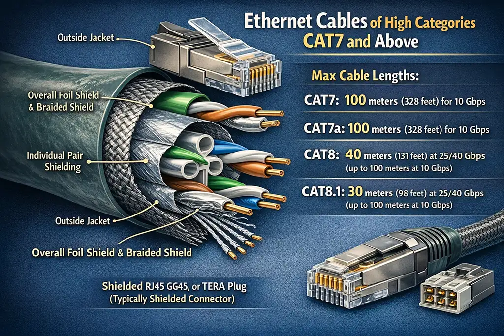 Максимальна підтримувана довжина кабелю. CAT7 і CAT7a підтримують швидкість передачі даних до 10 Гбіт/с на стандартній відстані Ethernet 100 метрів. Кабелі CAT8 в першу чергу призначені для центрів обробки даних і підтримують швидкість 25 або 40 Гбіт/с на коротших відстанях, зазвичай до 30-40 метрів, зберігаючи при цьому здатність передавати дані зі швидкістю 10 Гбіт/с на більших відстанях.