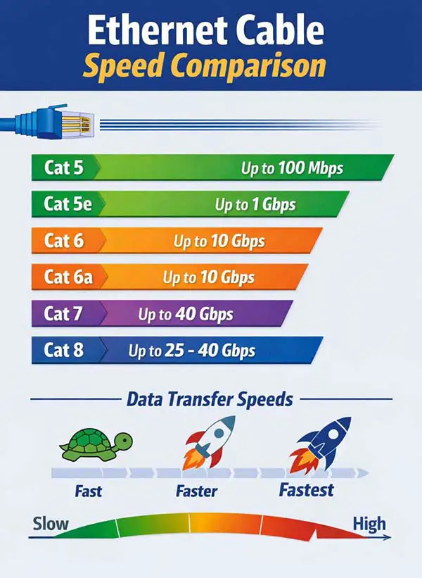 Для домашнього використання зазвичай достатньо кабелів Cat 5e або Cat 6. Cat 5e підтримує швидкість до 1 Гбіт/с, а Cat 6 може обробляти до 10 Гбіт/с на коротких відстанях. Більш високі стандарти, такі як Cat 6a, Cat 7, Cat 7a та Cat 8, призначені для професійного використання — серверів, офісів та підприємств, які потребують високої пропускної здатності та мінімальних перешкод.